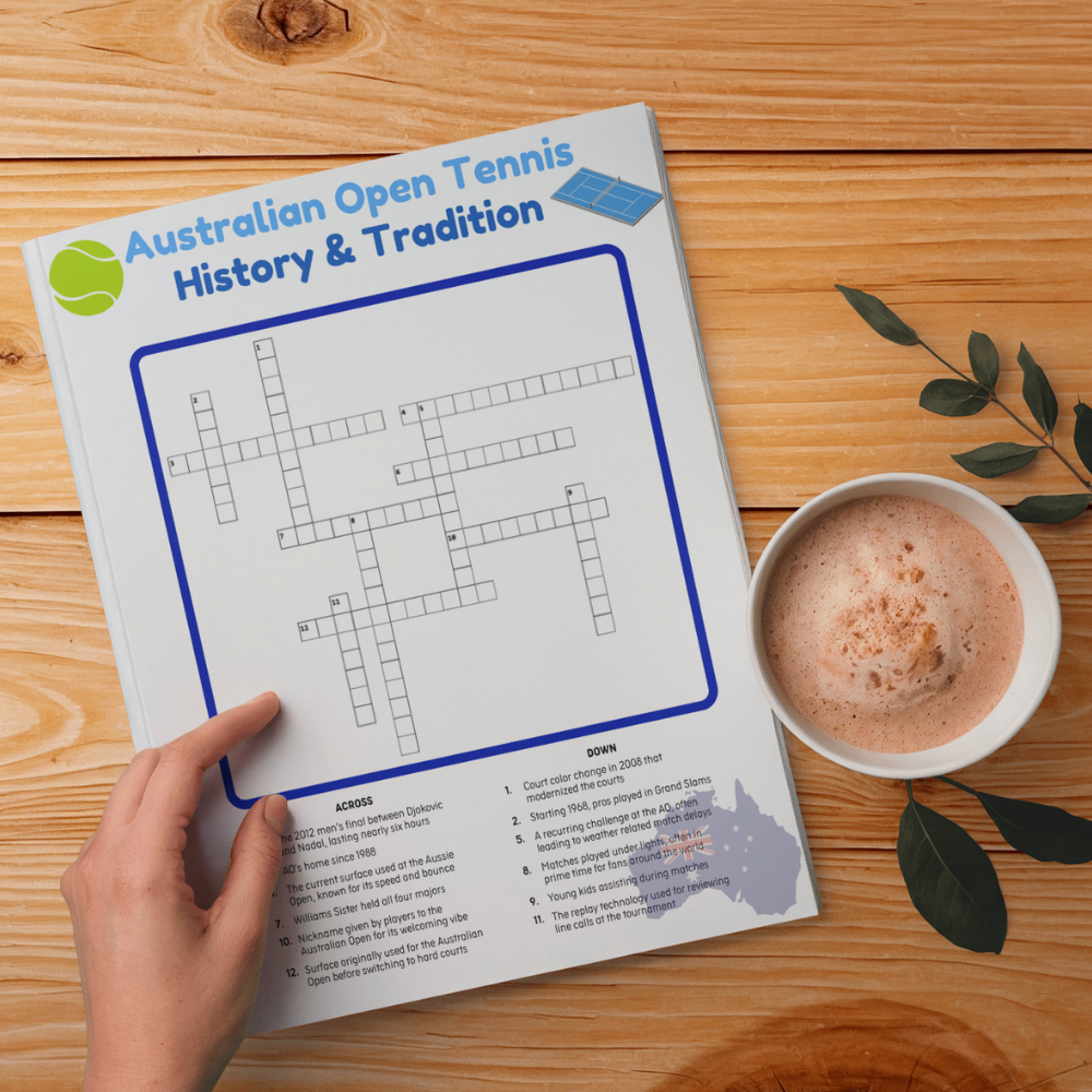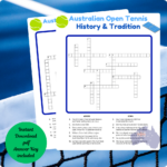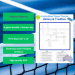 Celebrate the excitement of the Australian Open Tennis tournament in Melbourne with this engaging Tennis Crossword Puzzle Game! This digital download includes 5 printable crossword puzzles with answer keys, each inspired by unique aspects of the Australian Open, from tournament history and champions to historic Melbourne Park courts, food and drink, Aussie slang, and Australia themed tennis culture.